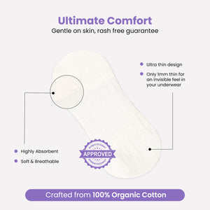 +Stay confident and comfortable with organic pads made from 100% pure cotton. Soft on skin, safe from harmful chemicals, and designed to prevent rashes. With secure leak protection and eco-friendly disposal, they care for you and the planet in every cycle. GOTS Certified and dermatologically tested, they offer gentle protection that’s safe even for sensitive skin.